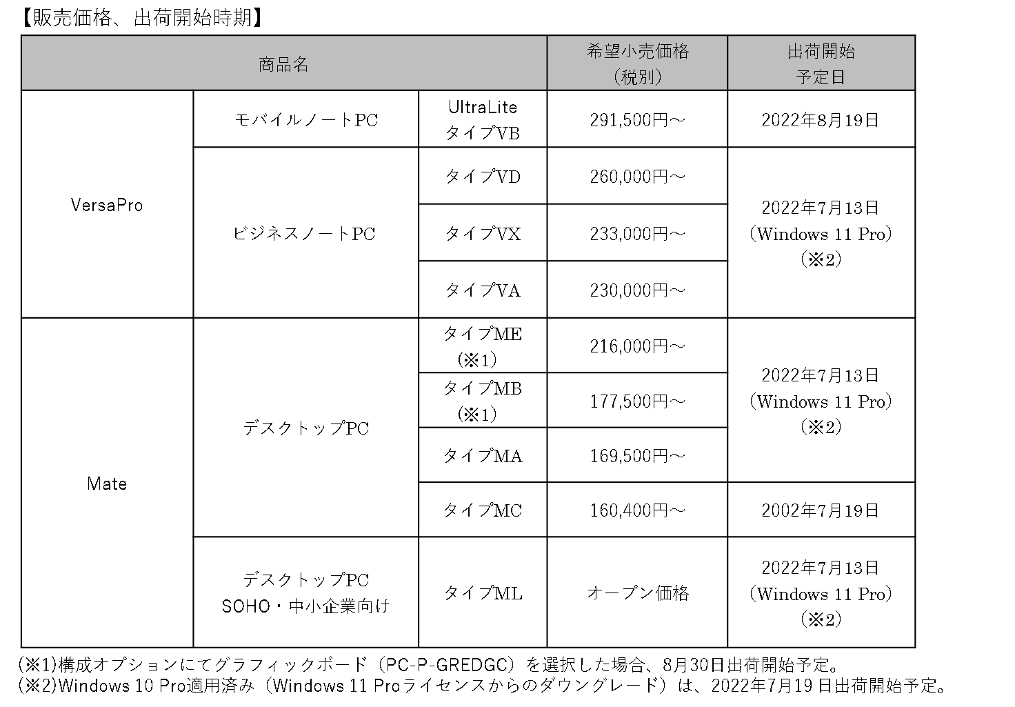 新商品では、インテル第12世代CPUおよび高速データ転送が可能なLPDDR5メモリの搭載により基本性能を向上したモバイルノートPC(VersaPro Ultralite タイプVB)およびデスクトップのハイエンドモデル(Mate タイプME)や、インテル vPro® Essentialsプラットフォーム搭載によりMicrosoft社が提唱するSecured-Core PCに新たに対応した15.6型スタンダードノートPC(VersaPro タイプVX)などをラインアップしました。