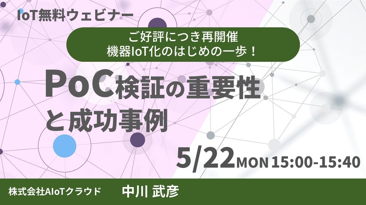 株式会社AIoTクラウド(本社:東京都江東区、代表取締役社長:松本 融)は、機器IoT化を検討・実施中の企画・開発者向けに、「機器IoT化のはじめの一歩!PoC検証の重要性と成功事例」のIoT無料ウェビナーを開催し、約50名の方にお申込みいただきました。ご好評につき、日程の都合が付かなかった方も参加いただけるよう、2023年5月22日(月)に再度開催いたします。