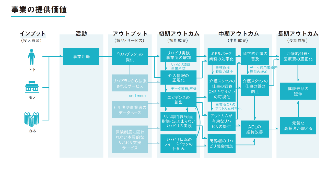 他方、本インパクトレポート掲載も4年目に入り、当社の事業拡大と組織拡大に伴い、以前よりもアウトプットとアウトカムの解像度が高くなって参りました。そこで、これまでのロジックモデルに「科学的介護の取り組み」や「今後、新たに生み出すプロダクト」を反映した新ロジックモデルを新たに設定することになりました。今後も当社は「健康寿命の延伸」という長期アウトカムの成果に向けて、「科学的介護の普及」および「要介護者の生活機能の向上」を目指した取組を行い、より野心的に「社会的価値」と「経済的価値」の双方を両立しながら高めて参ります。