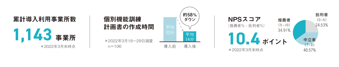 そのような状況下で、当社は要介護度が比較的低い要介護度1、2の認定者(要支援含む)数が多いデイサービスでのリハビリ提供をサポートすることで、重度化防止に寄与しています。併せて、高齢者やリハビリにまつわる情報を正規化し、分析、解析可能な状態に整えたうえでデータプラットフォームを構築し、今後の介護サービスの質向上と要介護者の生活機能の維持向上に貢献して参ります。