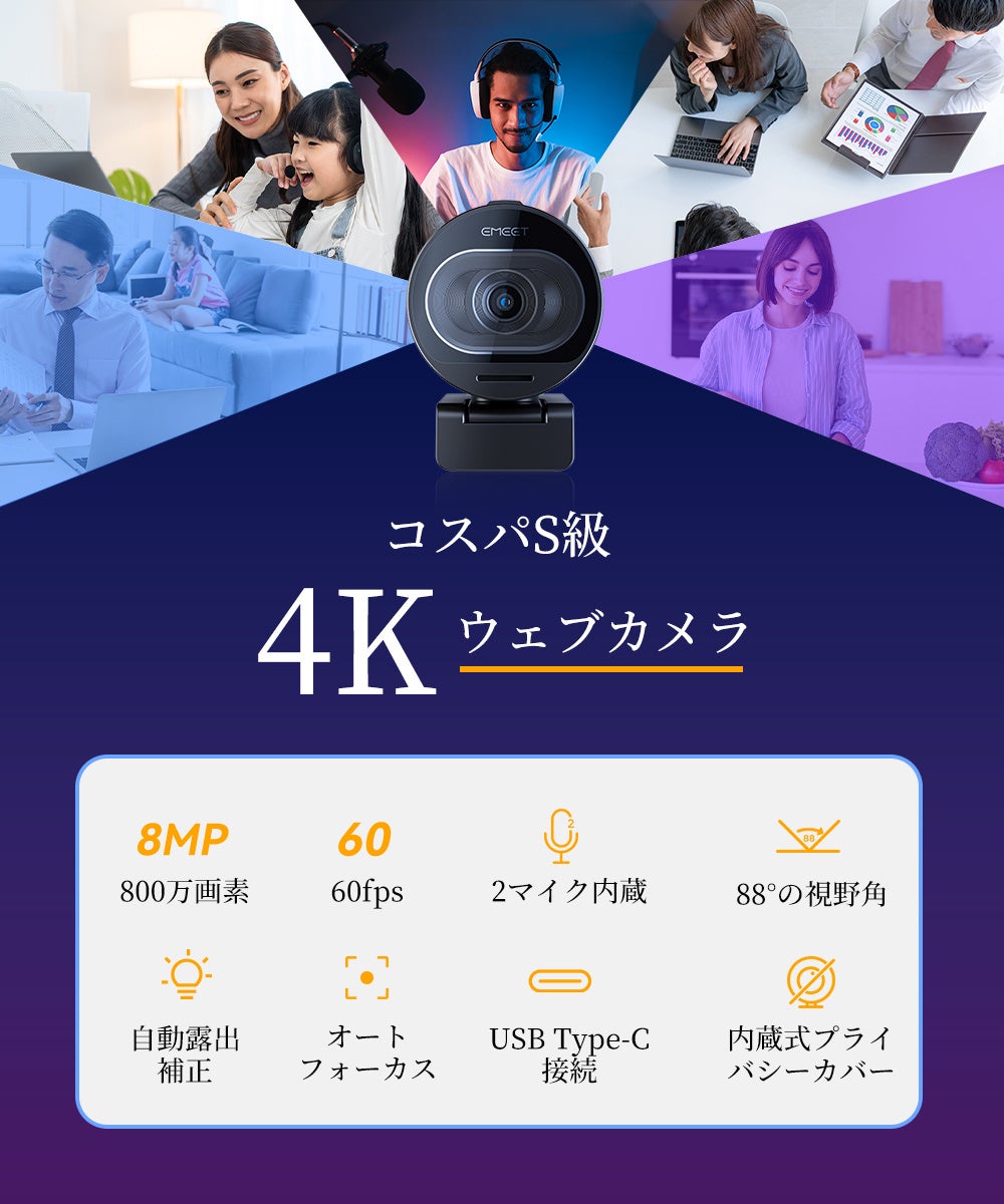 eMeet SmartCam S600ウェブカメラが4K対応・800万画素(最大3840 * 2160(30fps)の解像度)の驚くほど明るく鮮明な映像を実現。