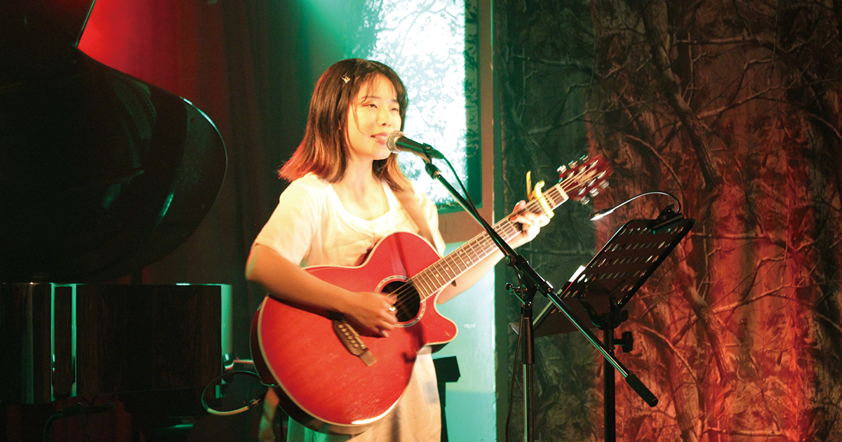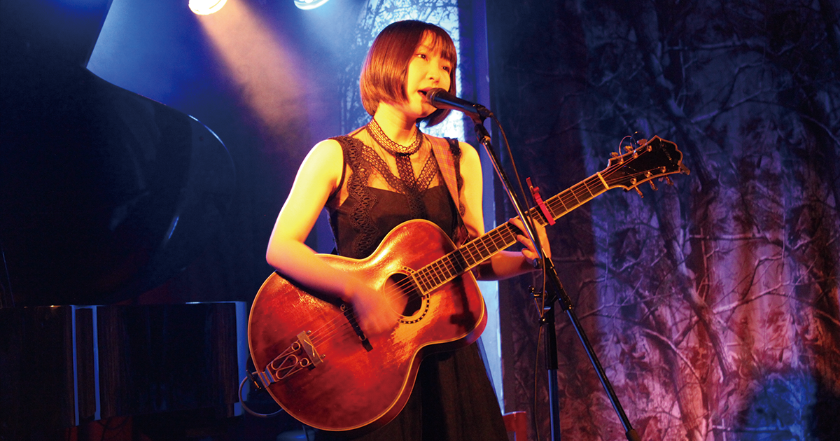 イベントのトリを飾ったのは、耽美的な世界観をベースにロック、ジャズ、昭和レトロ、バラードと幅広いジャンルを歌う二段優希。オープニングは伸びのある美しい歌声で会場を魅了した「月下美人」を熱唱。続いて、強烈なギター演奏と独特な歌声で「ストレイキャット」と「純恋喫茶で逢いましょう」の2曲披露した。会場はいままでの雰囲気とは違う耽美的な世界観に包まれ、レトロックさを感じさせる「恋のロマンス」から、流れるようなMCへと続いていく。“強く、清く、気高く”と言い放ち、彼女の真骨頂ともいうべき「Rebirth」で、豪華5組のシンガーソングライターが出演したイベントを締めくくった。