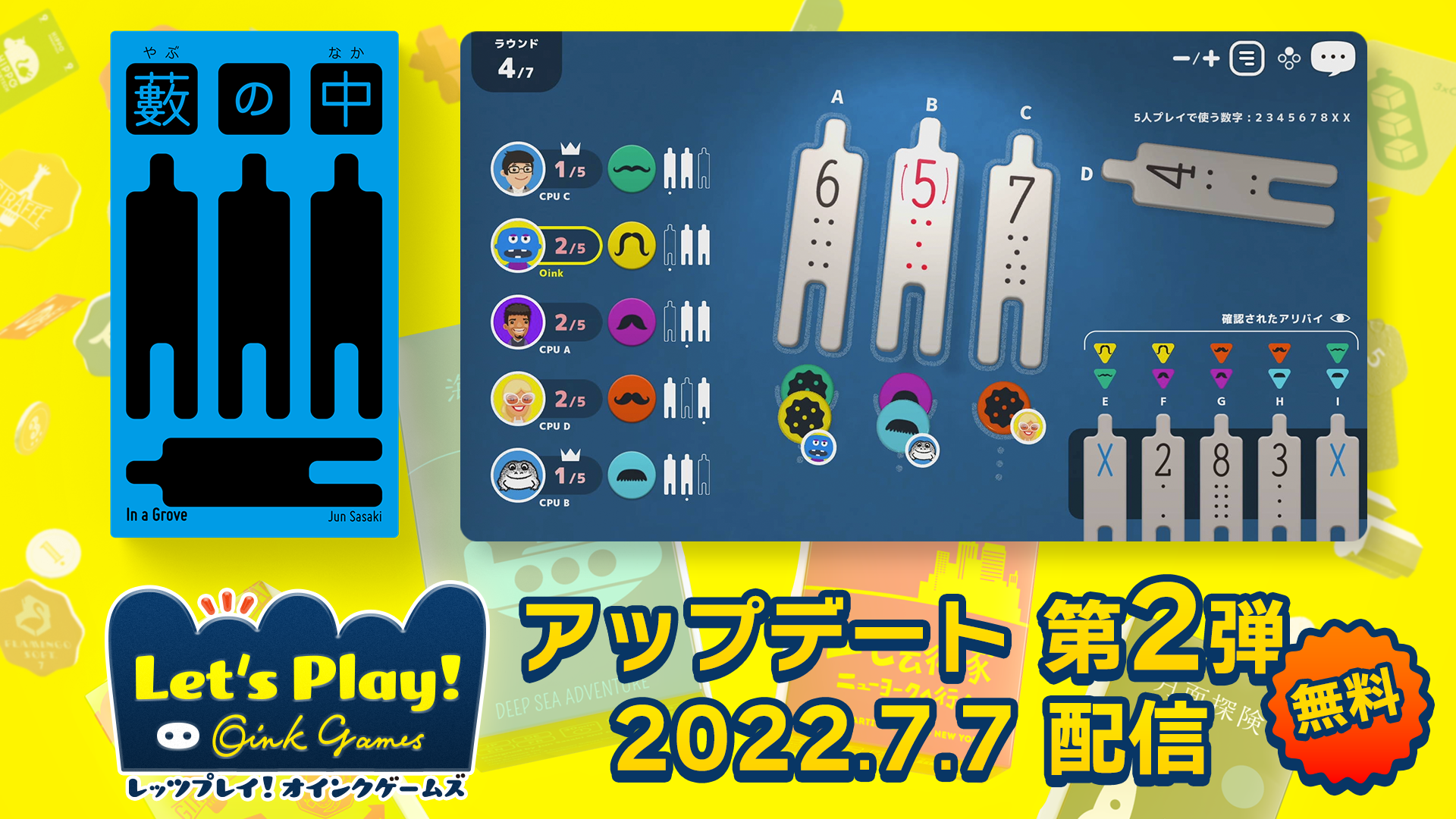 さらに、Nintendo Switch用ソフト「レッツプレイ!オインクゲームズ」を同時に無料アップデート。推理と騙し合いのゲーム「藪の中」を追加し、遊べるボードゲームが合計6本となったほか、より遊びやすくなるよう改善されています。