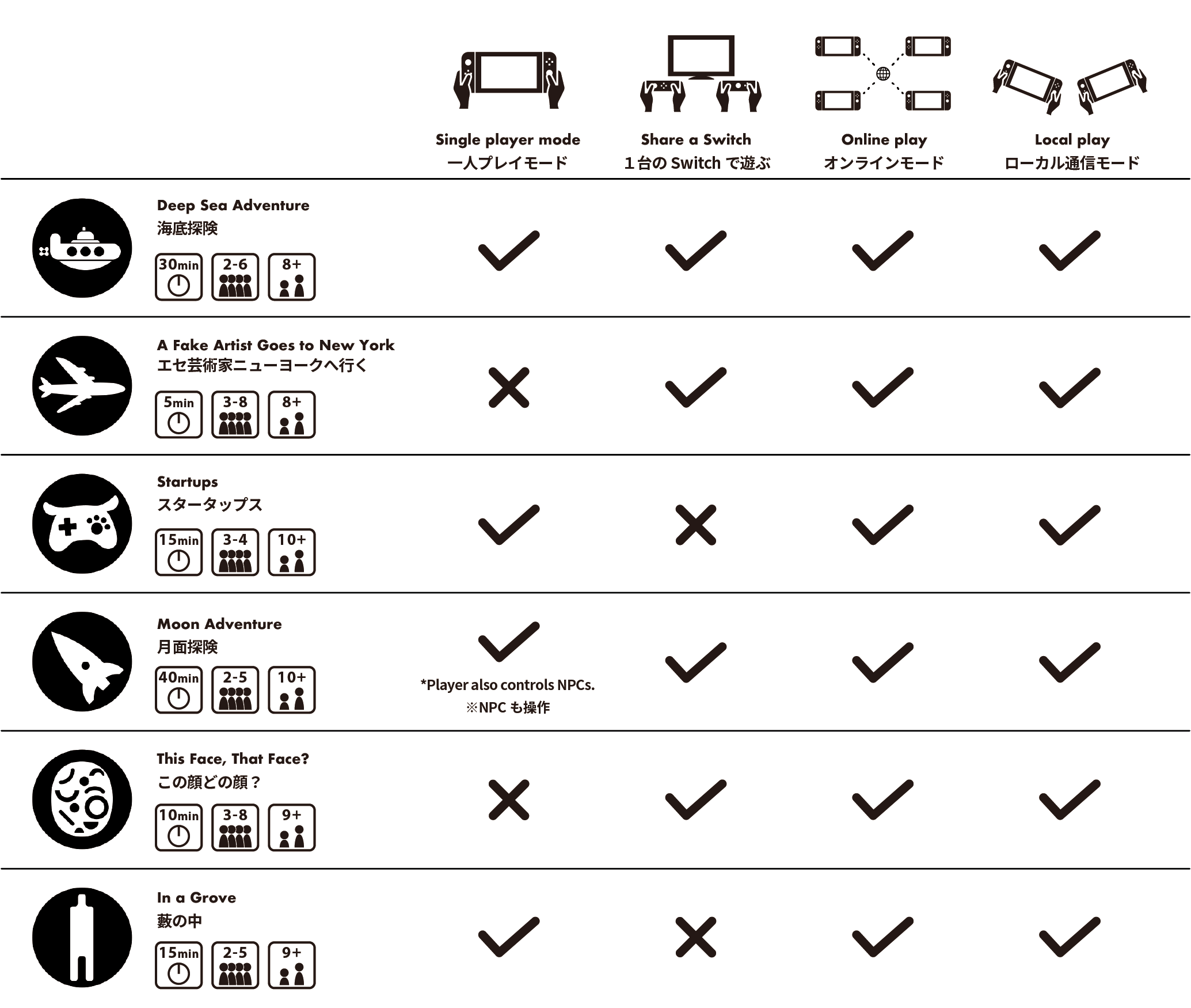 収録タイトルは、「藪の中」で6作目。その他のタイトルは、全世界で20万部のヒット作「海底探険」に、おえかき人狼ゲーム「エセ芸術家ニューヨークへ行く」。投資家となってお金を稼ぐことを目指す「スタータップス」に、宇宙飛行士となりミッションに挑む協力ゲーム「月面探険」。今年の3月には顔づくりパーティーゲーム「この顔どの顔?」が追加されたばかり。今後も、順次タイトルを追加予定です。