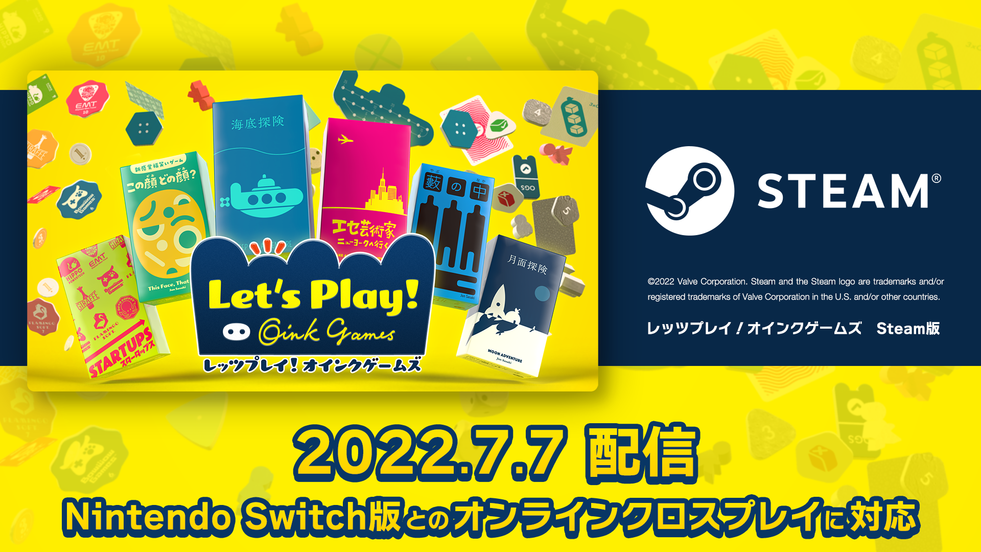 ボードゲームやデジタルゲームの開発を手がける株式会社オインクゲームズは、2022年7月7日、ボードゲームをデジタルで遊べる「レッツプレイ!オインクゲームズ」のSteam版をリリースしました。リリースを記念し、7月13日23:59まで10%オフの2,250円で販売します。
