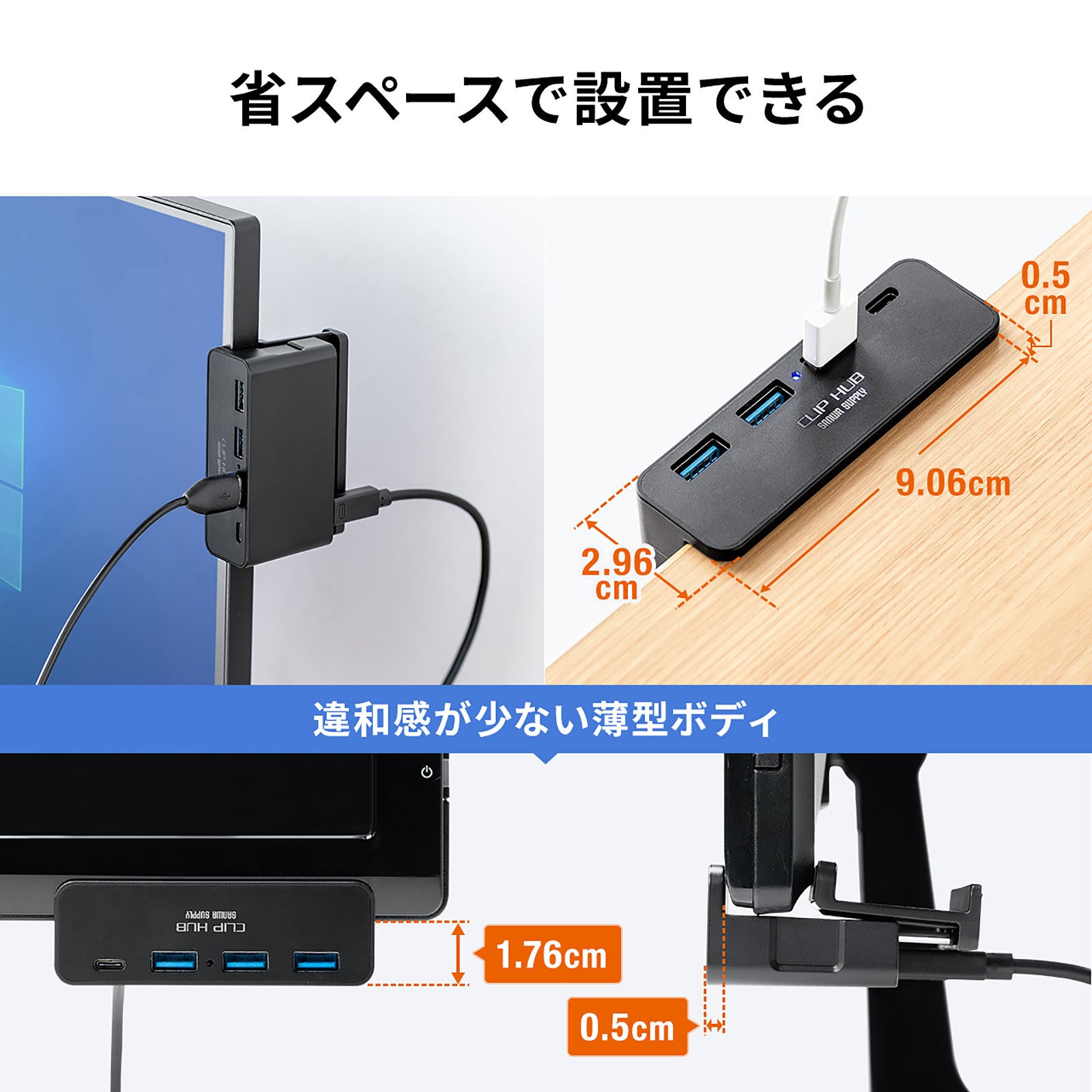 バネ内蔵クリップで机やモニターに挟んで設置できる、USB-A接続のUSB3.2Gen1ハブ。USB A×3、Type-Cポート×1搭載でケーブル長1.5mのUSBハブ。【WEB限定商品】【USBハブ】のサンワ ダイレクトの通信販売!