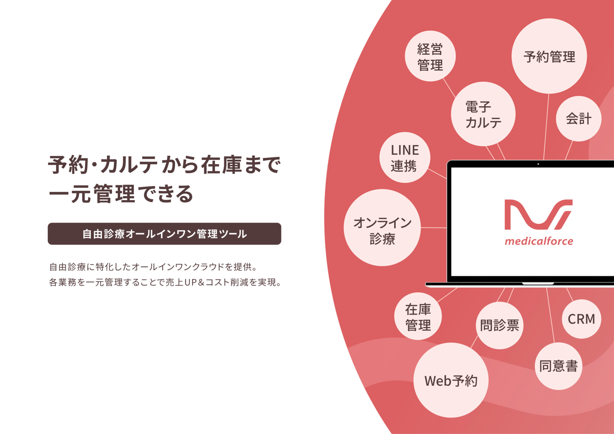 「medicalforce」は自由診療・美容クリニックの現場業務を1つのシステムで管理可能にするオールインワンSaaSです。診療の予約や問診、電子カルテなどの日常業務をカバーする機能に加えて経営管理や顧客情報管理(CRM)の機能、また「LINE」との連携など、患者様の利便性を高める機能も追加が可能です。