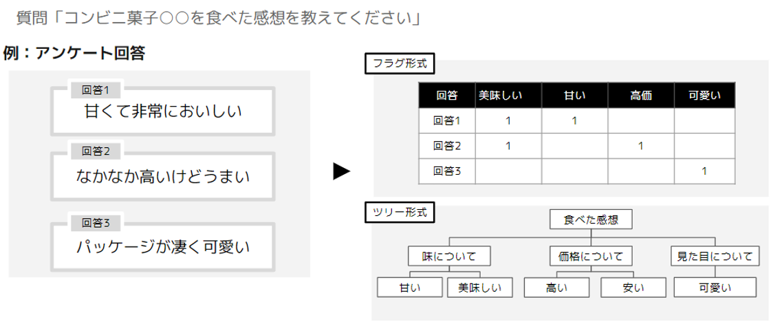 Senjuは、高度な自然言語処理技術を用いて、テキストデータを自動的に分類することができるAI サービスです。機械学習の技術を活用して、文を意味でマッピングしそれぞれのカテゴリに自動的に分類することが可能です。1つの文章に複数のカテゴリが当てはまる場合は、複数のフラグを立てることで回答を網羅的に分類することができます(下図参照)。