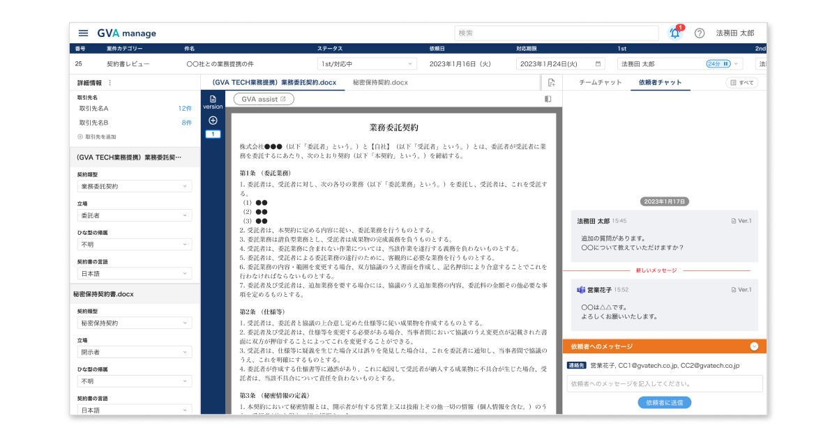GVA manage(ジーヴァマネージ)は、契約書の作成・レビューや法律相談などの法務案件を一元管理するクラウドサービスです。法務案件を依頼する事業部担当は専用のアカウントが不要で、普段やりとりに使用しているメールやチャットツールに返答するだけで、法務と事業部間の質疑などメッセージや契約書などの添付ファイルを、GVA manageに集約することができます。法務部は集約されたデータを検索することができ、過去案件の調査に掛ける時間を大幅に削減できます。