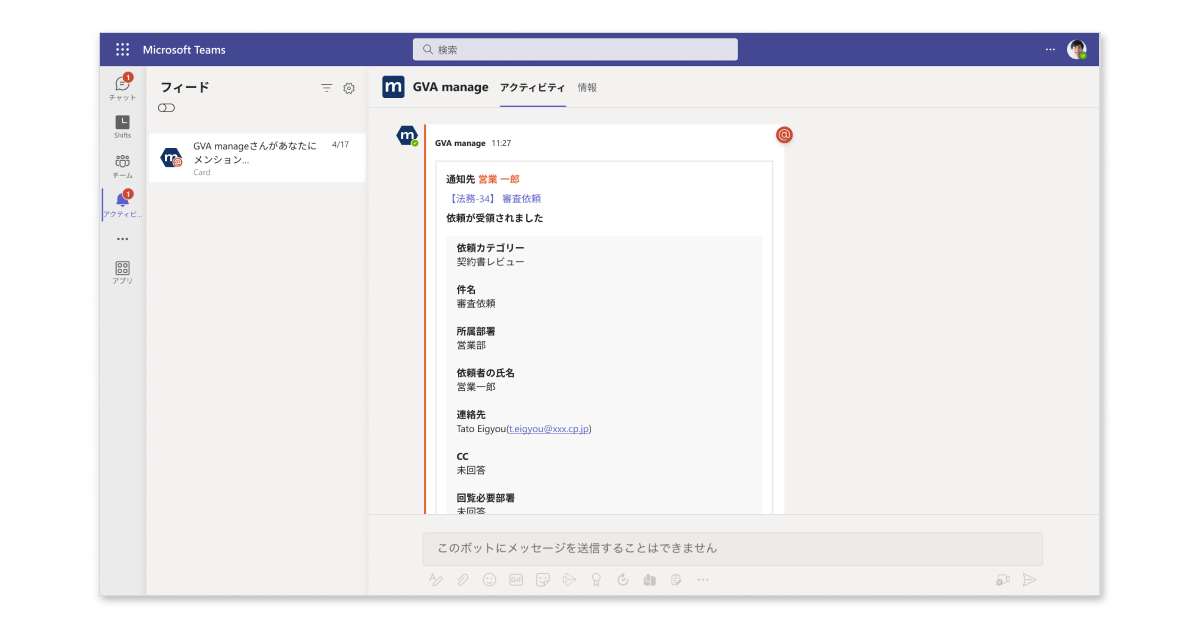 GVA manageで用意した専用フォームから法務案件を依頼した後は、Teamsのアクティビティに通知を受け取れます。