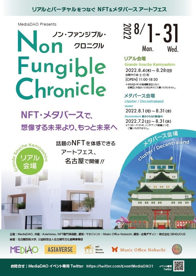 MediaDAOでは、2022年8月、名古屋市名東区に所在する音楽マンション『グランドスーシュ上社』にて、当時最大級規模となるNFTアートのリアルイベント「Non Fungible Chronicle(ノン ファンジブル クロニクル)」を開催しました。