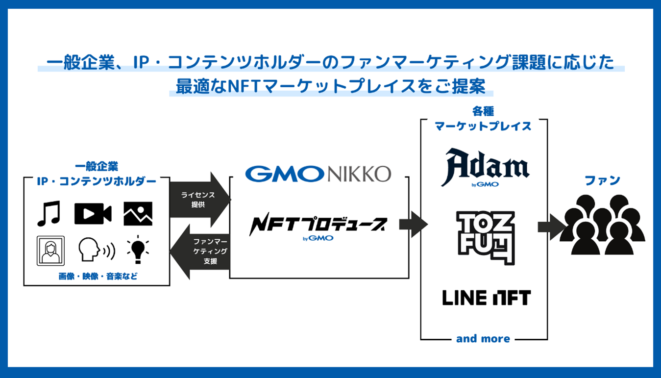 デジタルマーケティングを主とする総合マーケティング支援事業を展開してきたGMO NIKKOは、2021年にNFT事業推進室を立ち上げ、2022年10月からは「NFTプロデュース byGMO」の提供を開始し、著名アーティストやプロスポーツチームなど様々な分野において、NFTを活用したファンマーケティングを支援してまいりました。