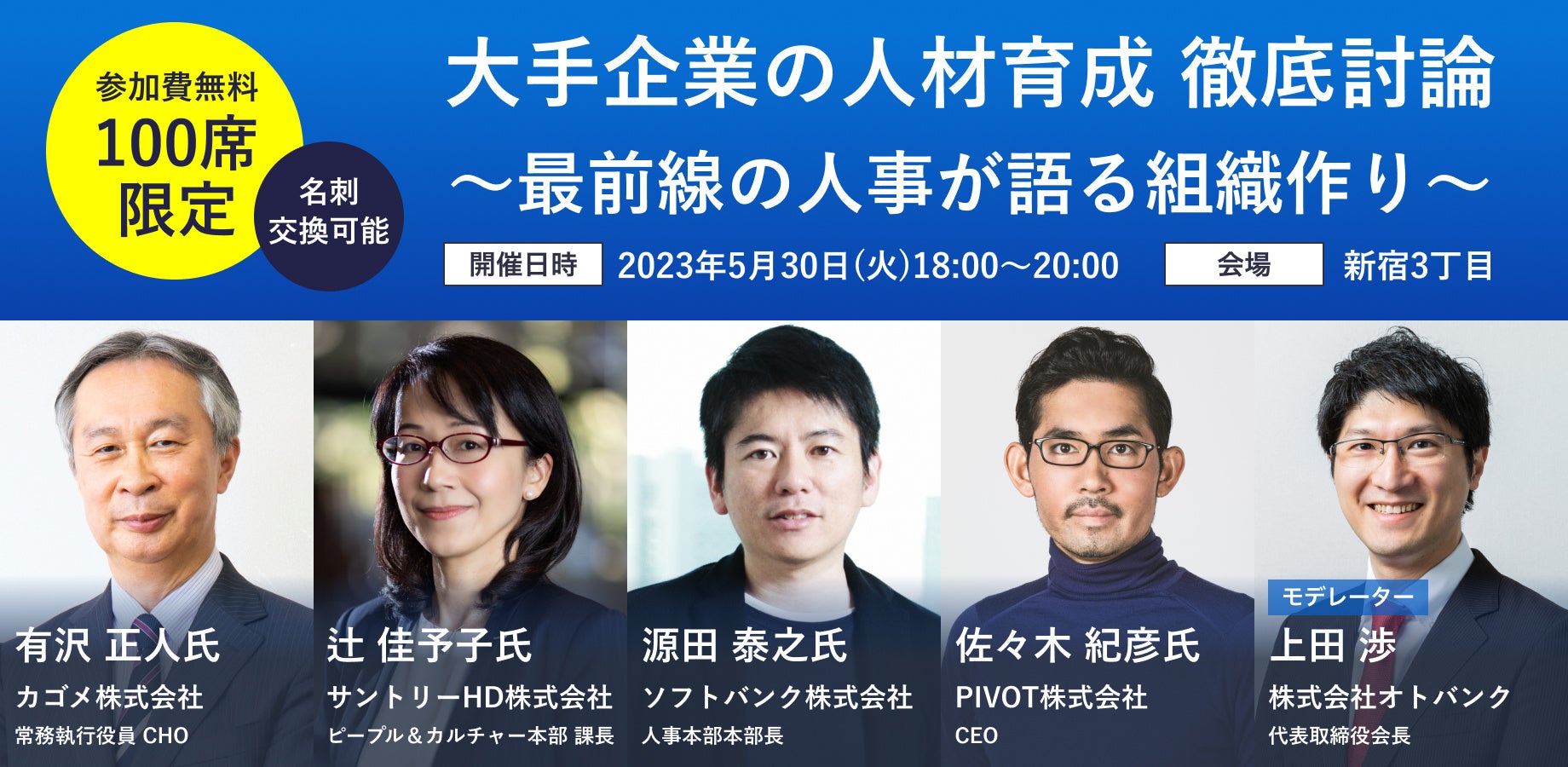 そこで今回、様々な人事改革をグローバルに成し遂げてきたカゴメ株式会社・有沢正人氏と、社内大学を設置し人材育成に注力しているサントリーホールディングス株式会社・辻佳予子氏、3社統合の中で人事組織を作りあげてきたソフトバンク株式会社・源田泰之氏、「東洋経済オンライン」編集長や「NewsPicks」創刊編集長などを経て現在はビジネス映像メディアを運営するPIVOT株式会社の佐々木紀彦氏の4名をお招きし、大手企業の人材育成の秘訣に迫る討論会を実施します。