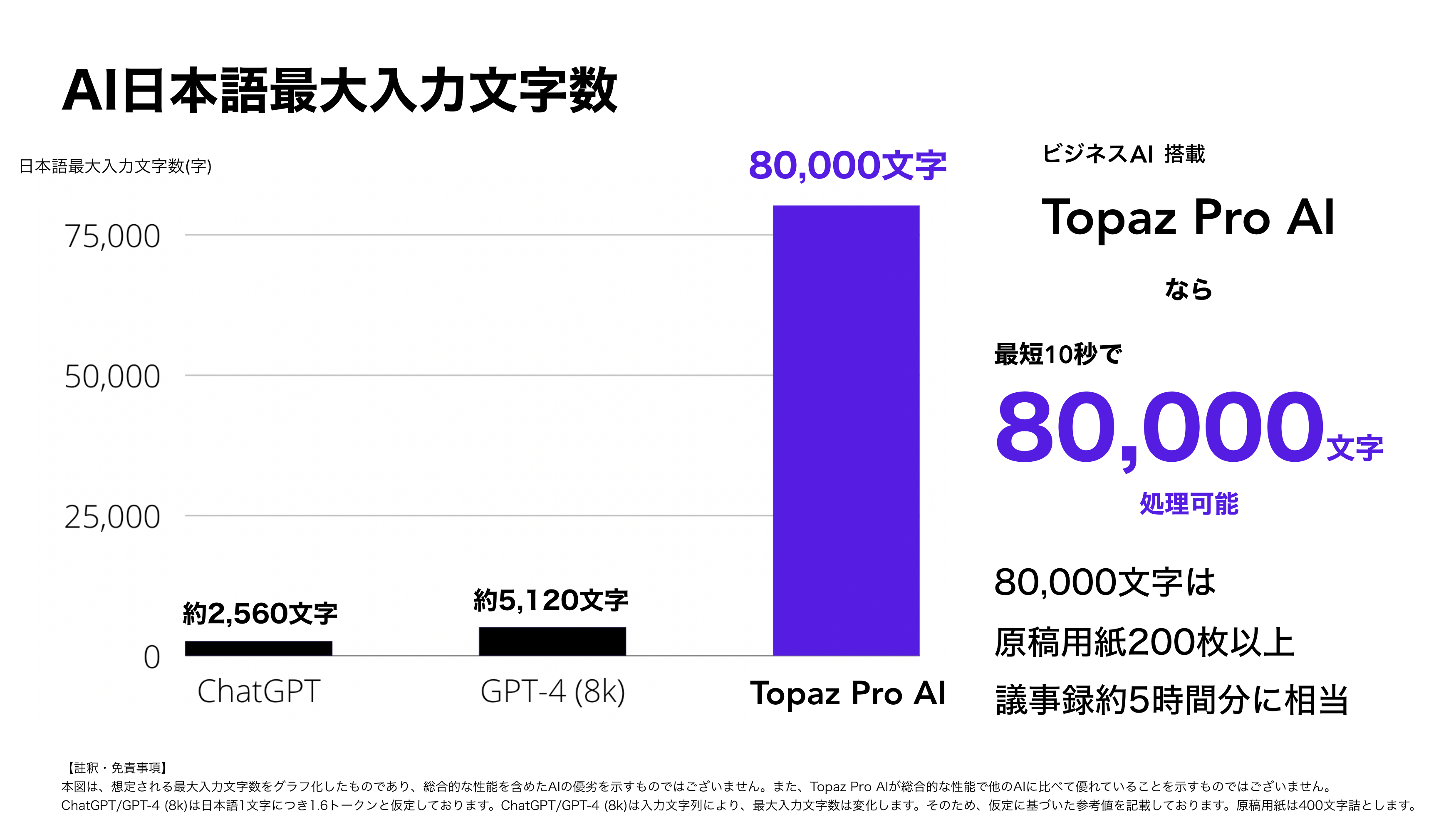 「Topaz Pro AI」は、「8万文字の日本語入力に対応したAI」として日本初の提供となります。(自社調べ 2023年5月15日)