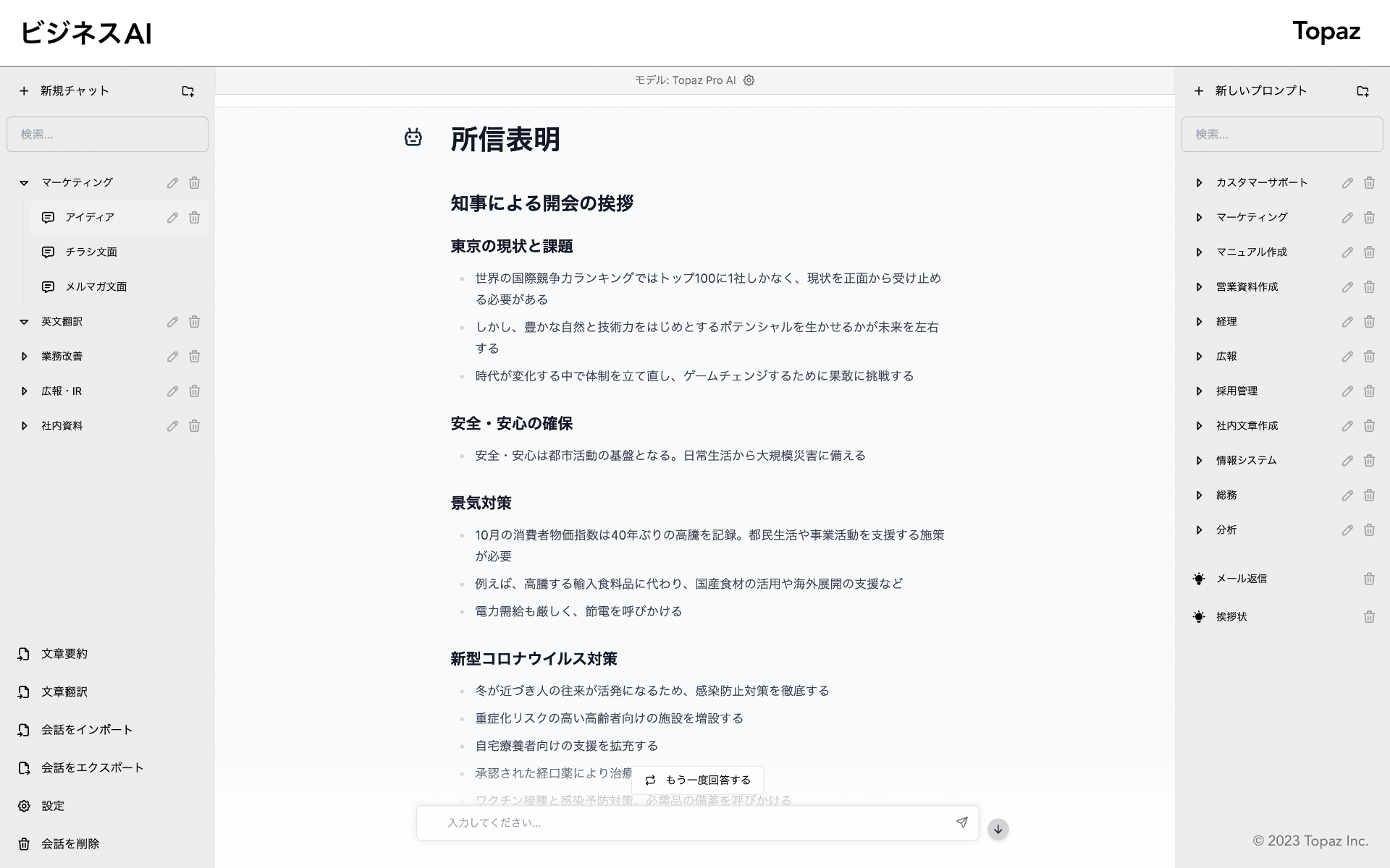 「Topaz Pro AI」搭載「ビジネスAI」利用画面 (引用: 令和4年12月1日東京都議会)