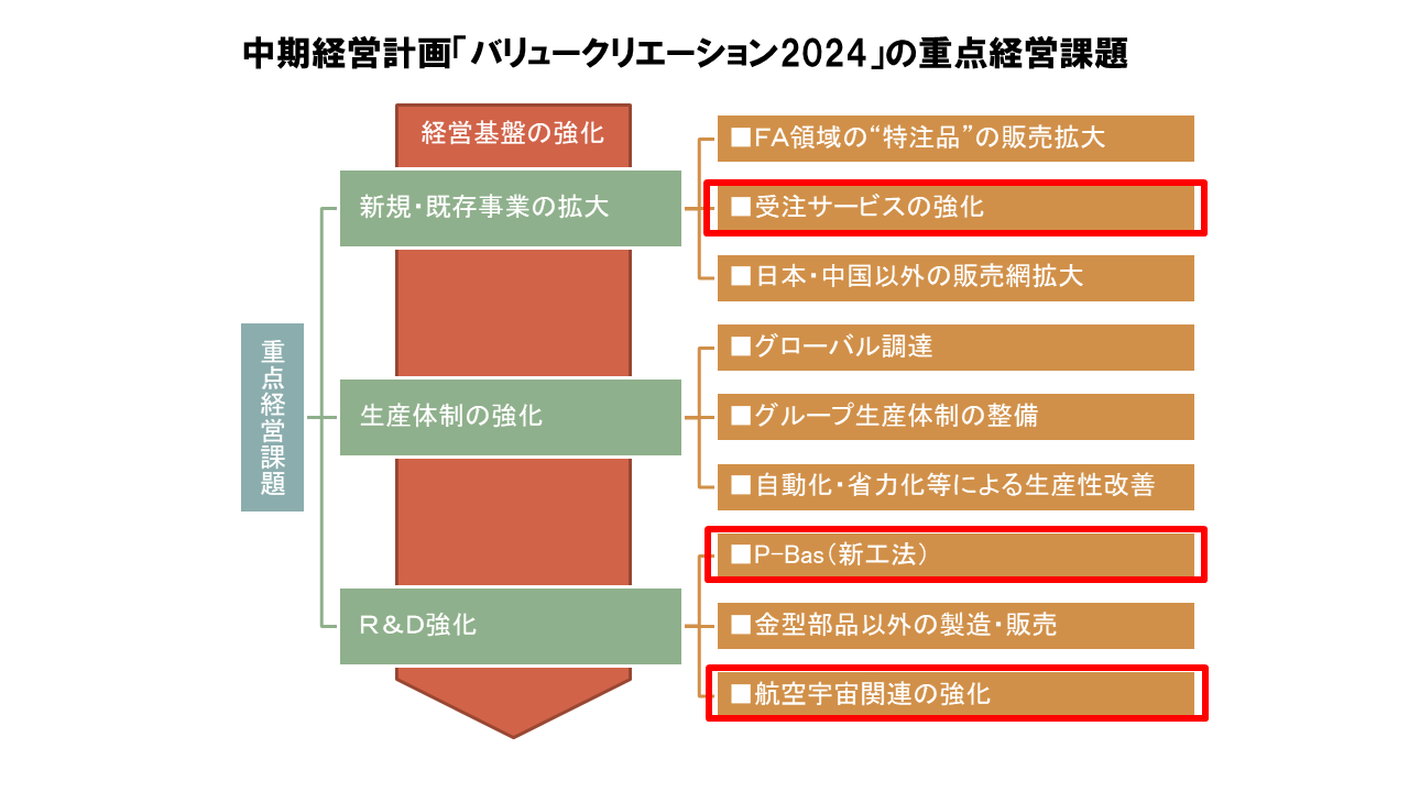 ダイモンとの業務提携により、このうち「新規・既存事業の拡大」の施策の一つである「受注サービスの強化」、また「R&D強化」の取組みの一環である「P-Bas」、「航空宇宙関連の強化」の更なる推進を図ります。