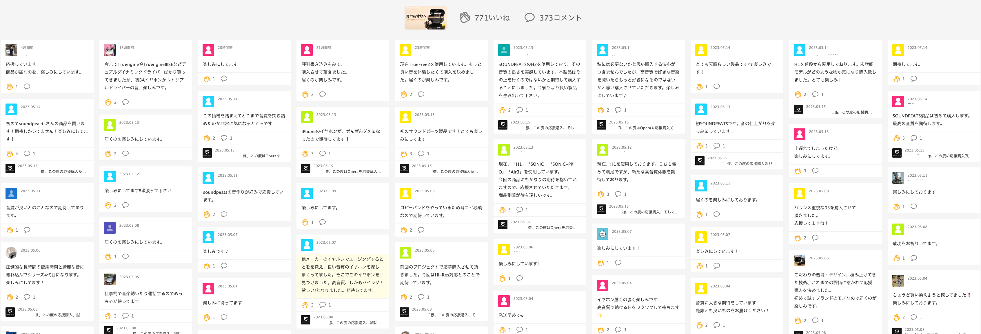 本プロジェクトでは360件以上の応援コメントが集まっており、日頃よりSOUNDPEATS製品を愛用いただいている方からの温かいお言葉がたくさん届いています。