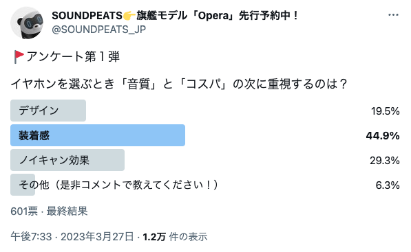 2023年3月にSOUNDPEATS公式Twitterで「イヤホンを選ぶとき『音質』と『コスパ』の次に重視するのは?」というアンケートを実施したところ、約45%の方が「フィット感」を重視するという結果になりました。