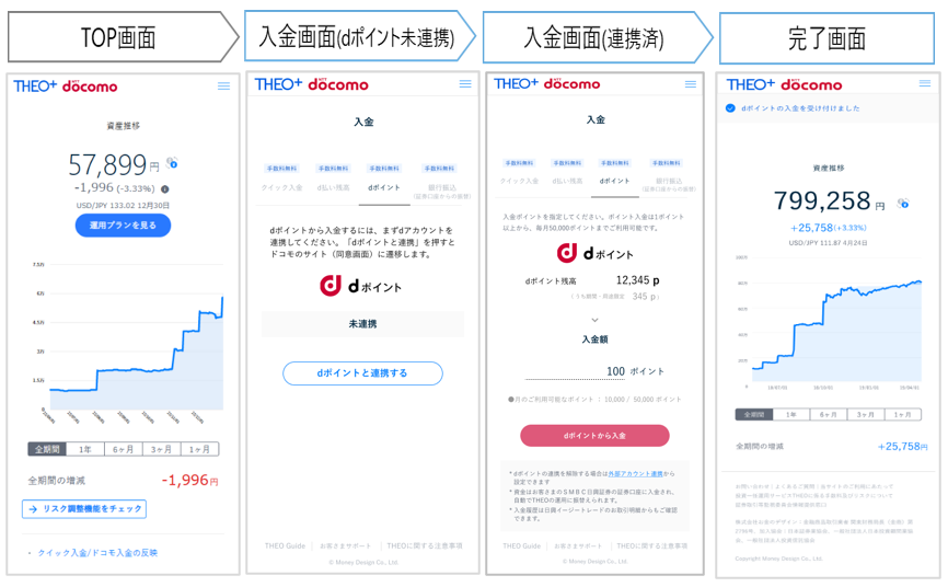 本機能が新たに提供されることで、dポイントを1ポイント=1円単位で、お金のデザインの提携金融機関においてお客さまが開設された「THEO+ docomo」の口座に入金することが可能(※2、※3)となります。これにより、お客さまは銀行振込やdカード積立などによる入金に加え、dポイントを活用して、資産運用サービスをご利用いただけるようになります。dポイントは通常ポイント、期間・用途限定ポイントともにご利用いただけます。