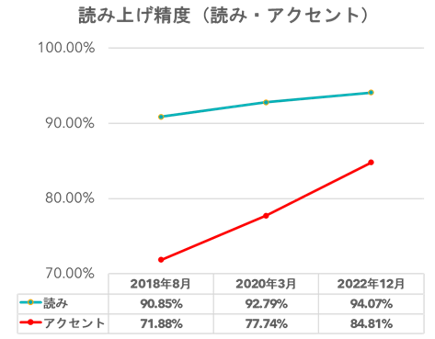 エーアイでは今般、ニュース記事を正しく読み上げる調査を社内で実施致しました。調査方法は、139の ニュース記事(5,464文章・203,454文字)をピックアップし、読みやアクセントなどの間違いを、2018 年8月リリース版・2020年3月リリース版・最新の2022年12月リリース版で比較し、最新版では94.07% の精度となりました。3バージョンの調査結果は以下の通りです。