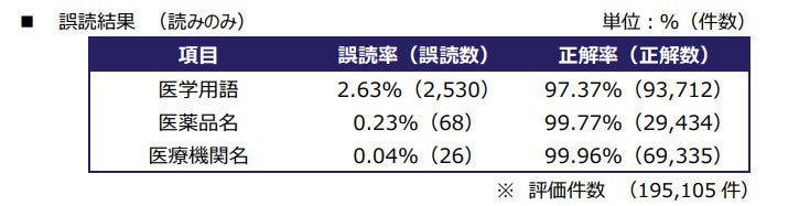「医療用語拡張版辞書」は、医学用語、医薬品名、医療機関名など、約11万語を登録し、医療関連用語 の読み上げ精度向上を目的とした拡張辞書です。 「医療用語拡張版辞書」を用い、実践医療用語・全国保険医療機関(病院・診療所)一覧・指定難病病 名一覧表などから抽出した195,015件の用語を正しく読み上げるかどうか、社内で調査した結果は以下の通りです。 この拡張辞書を使うと、標準版では読めない用語も含め、医学用語・医薬品名・医療機関名について平均99.03%の読み上げ精度となり、医療用語の読み上げ機会の多いお客様向けにご活用いただける製品です。