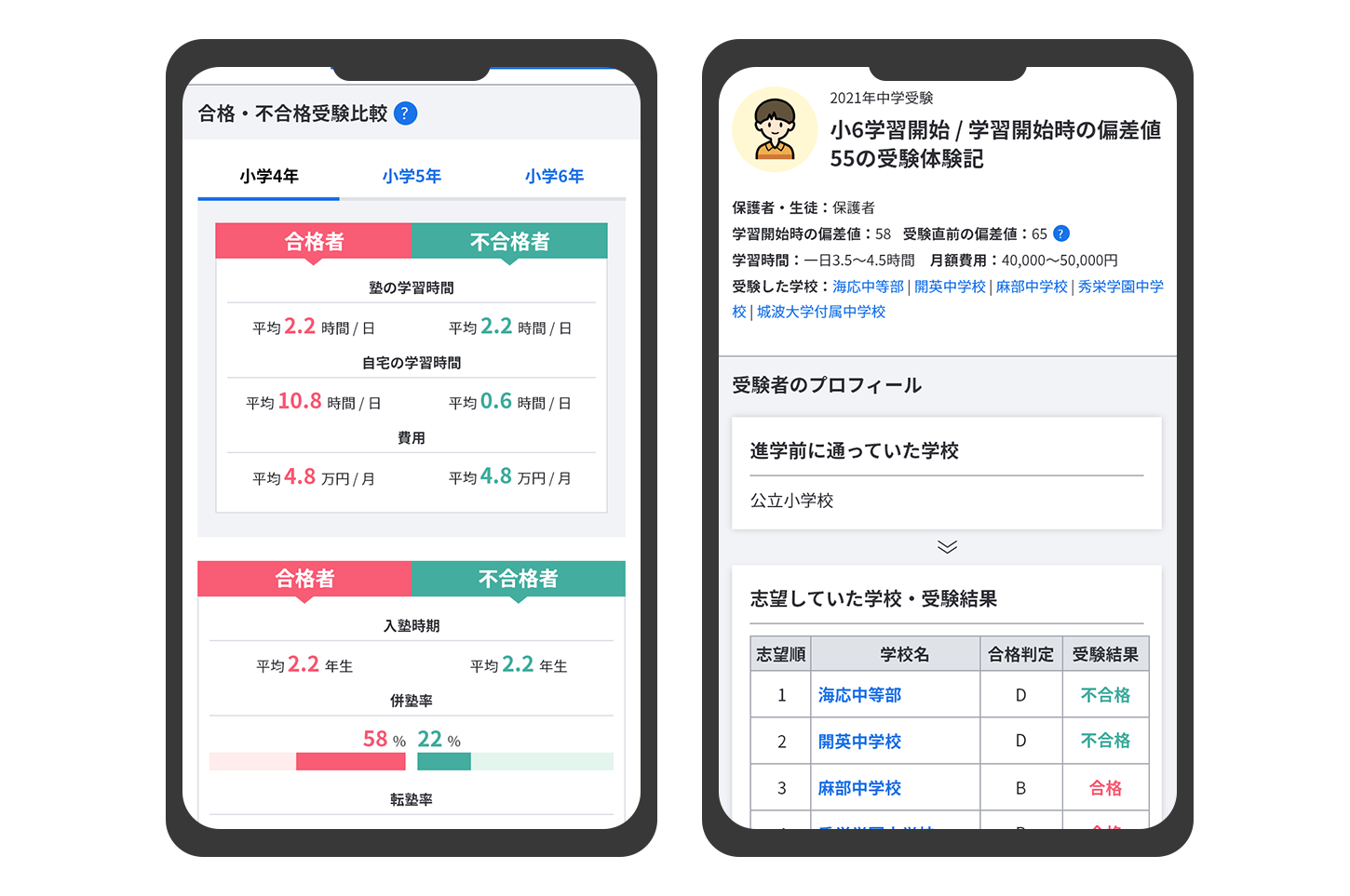 『塾選』サイト内で志望する中学校や高校を選択すると、その学校の合格・不合格者の受験データ(塾での学習時間、自宅の学習時間、塾にかけた費用や、学習開始)や学習開始時から受験時まで