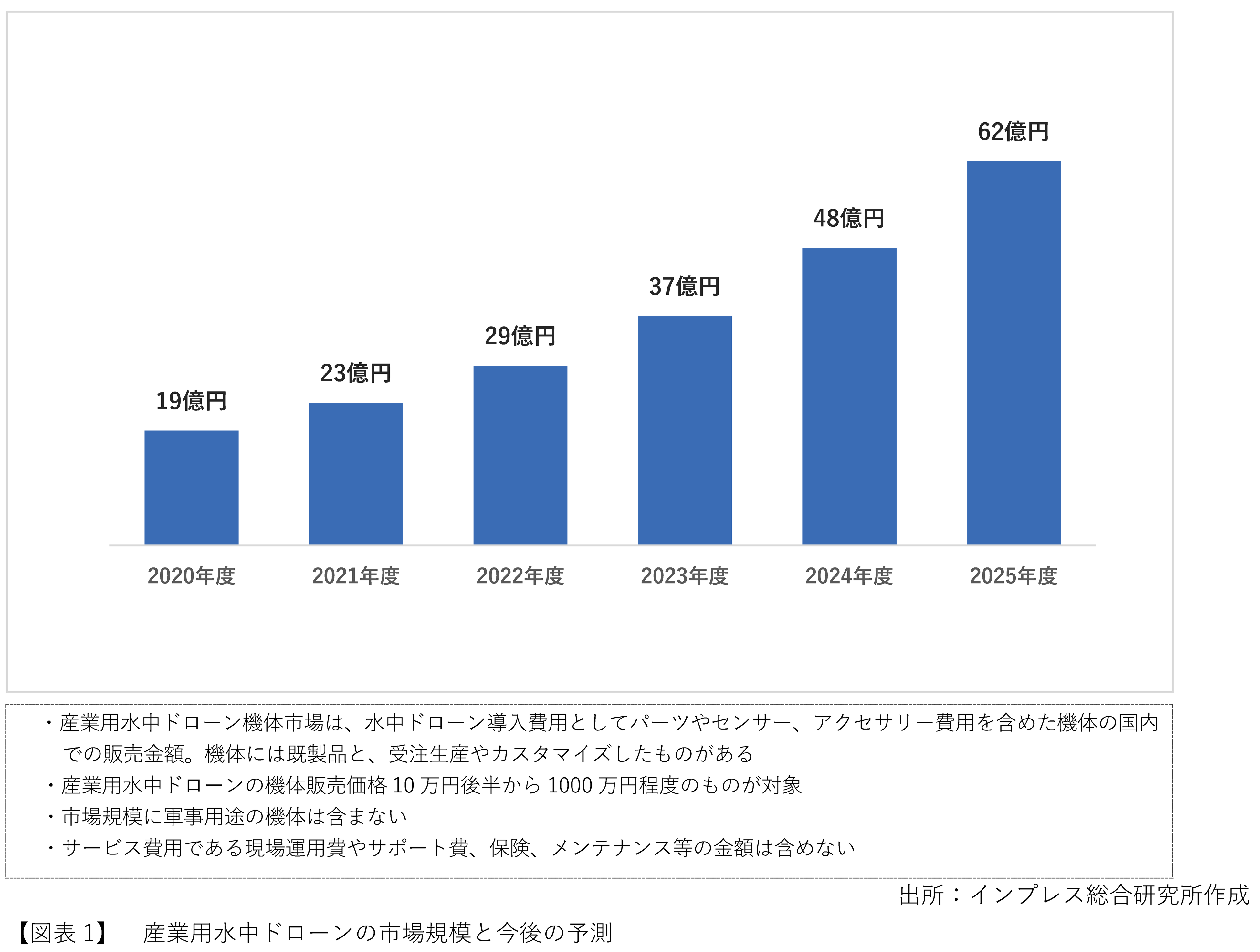 ■産業用水中ドローンの市場規模は23億円、2025年度に62億円に伸長