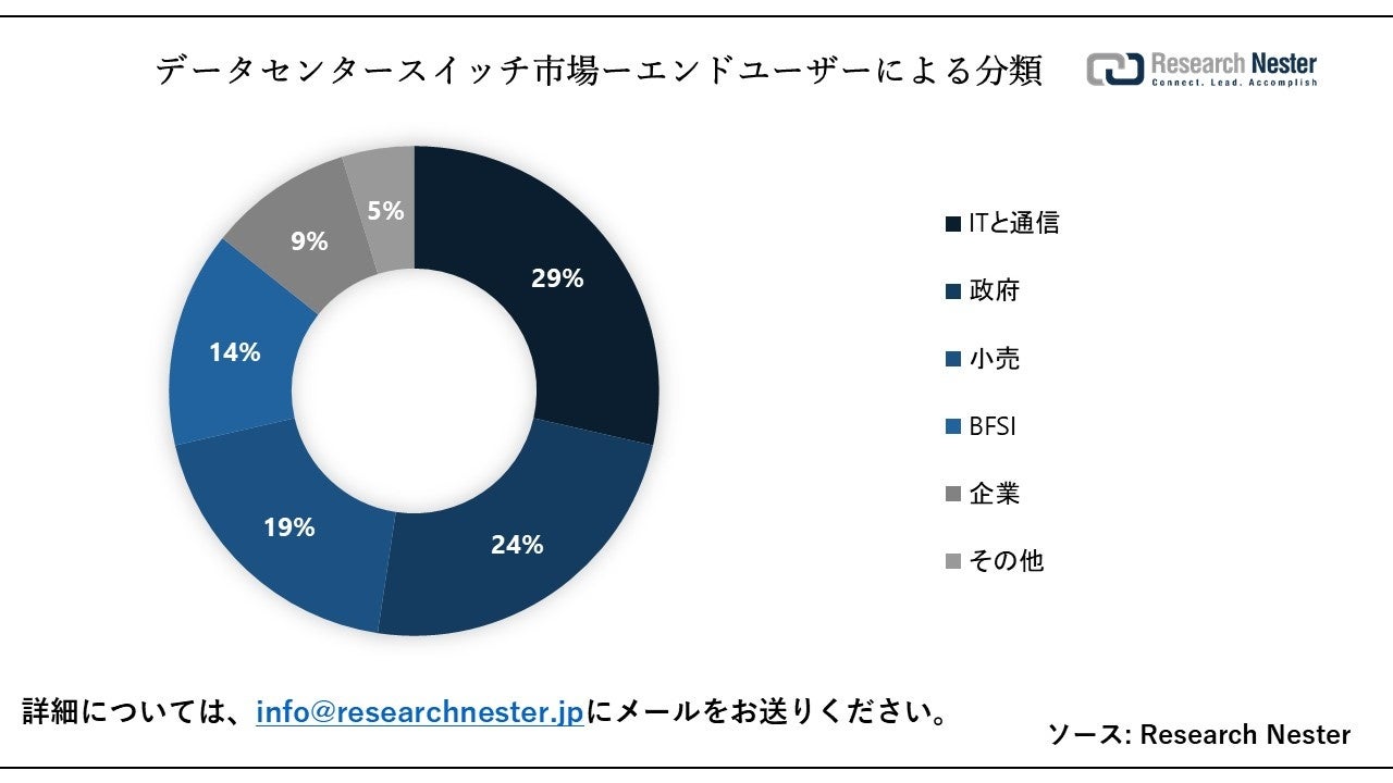 当社のデータセンタースイッチ市場調査によると、世界市場はエンドユーザーごとに需要と供給を政府、ITと通信、小売、BFSI、企業などに分割して分析されています。このうち、IT・通信部門が予測期間中に最大のシェアを占めると予想されます。これは、企業の規模に応じて、IT 部門がその運用のためにハイパースケール データ センターとオンプレミスのプライベート データ ストレージを必要としていることが原因であると考えられます。さらに、SaaS プロバイダーの急増に伴い、クラウド ストレージの人気も高まっています。たとえば、現在世界中で 29,999 社以上の SaaS 企業が活動しています。