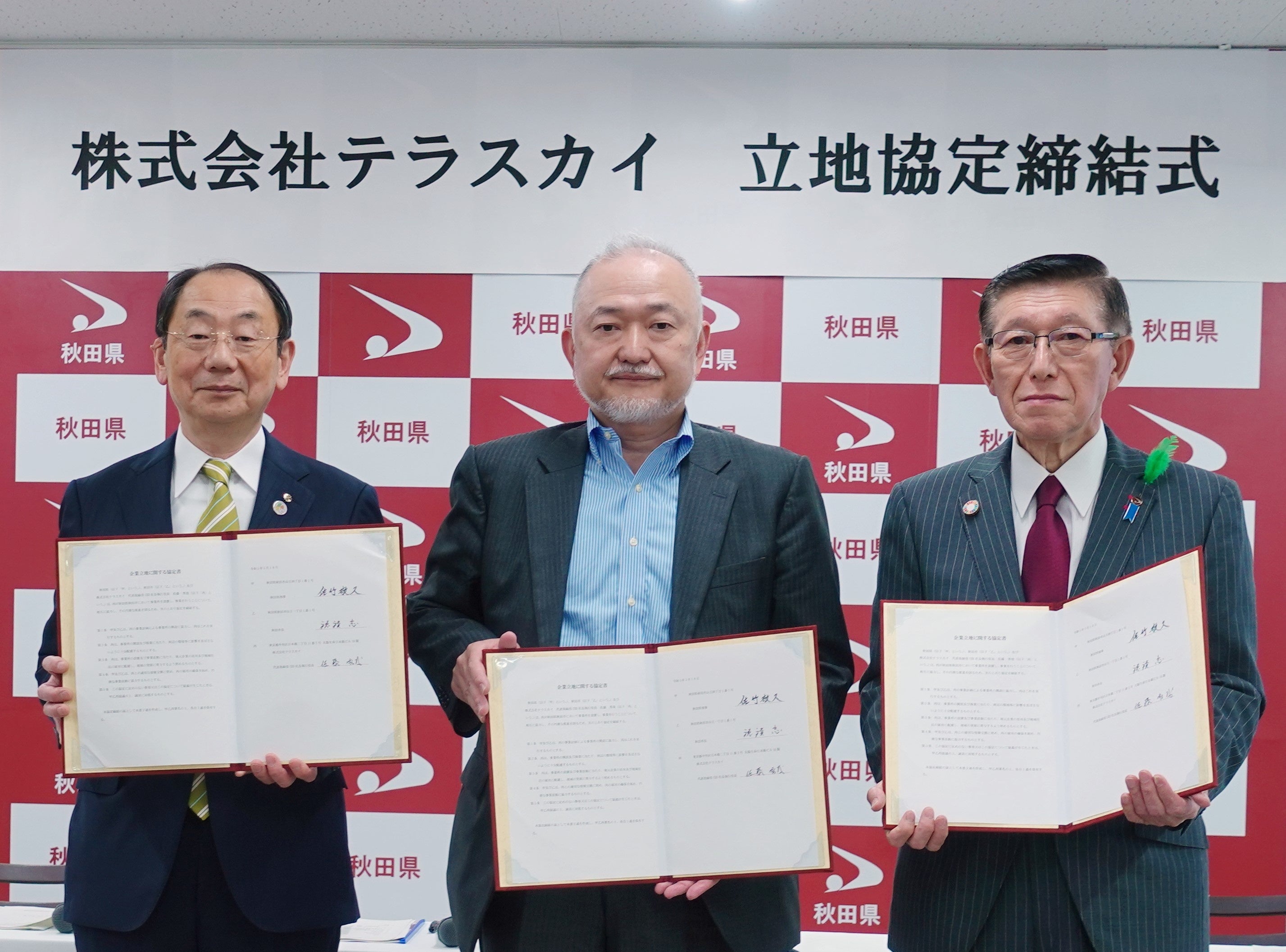 写真:(左)穂積 志 秋田市長(中央)テラスカイ 佐藤 秀哉 代表取締役CEO 社長執行役員(右)佐竹 敬久 秋田県知事