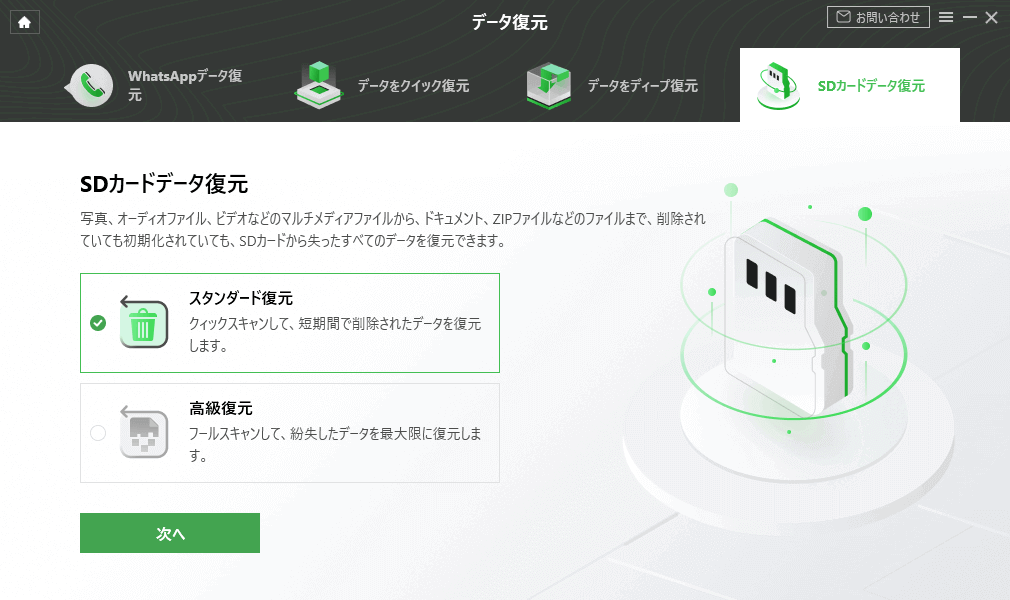 Step4、スキャンタイプを選択します。速度と精度のバランスを取るため、「スタンダード復元」を実行することをお勧めします。