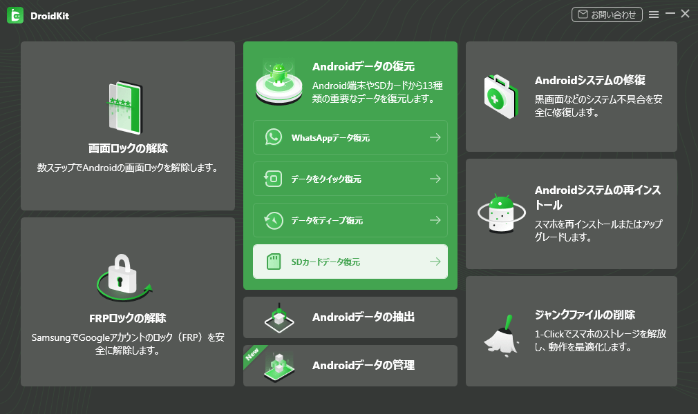 Step2、DroidKitを起動し、「SDカードデータ復元」をクリックします。