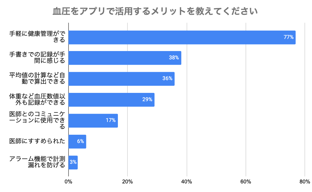 血圧管理にアプリを活用する理由をアンケートしたところ、「手軽に健康管理ができる(77%)」が最も多く、次に「手書きで記録が手間に感じる(38%)」が続く結果となりました。