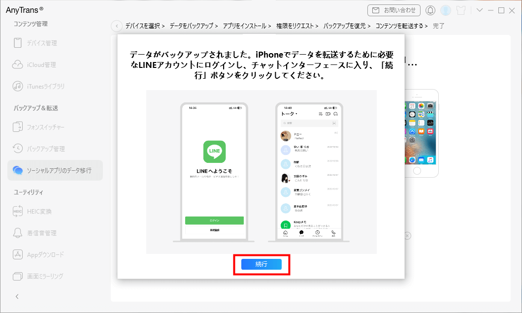 以下は、AnyTransを使用してAndroidからiPhoneにLINEトーク履歴を移行する手順です。