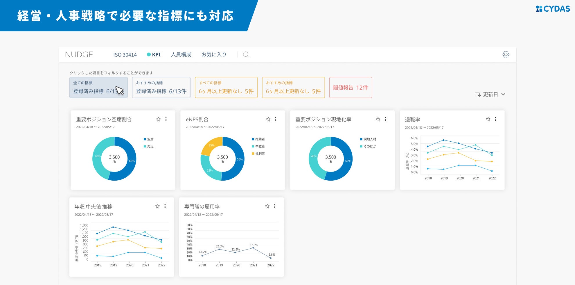 ISO 30414の指標だけでなく、経営・人事戦略で必要となる指標を幅広く提供予定です。開示に必要な項目のみならず、社内目標の達成状況を確認するためにもご活用いただけます。閾値をオーバーした際には赤字でアラートが出るため、クリアできていない項目が一目でわかります。