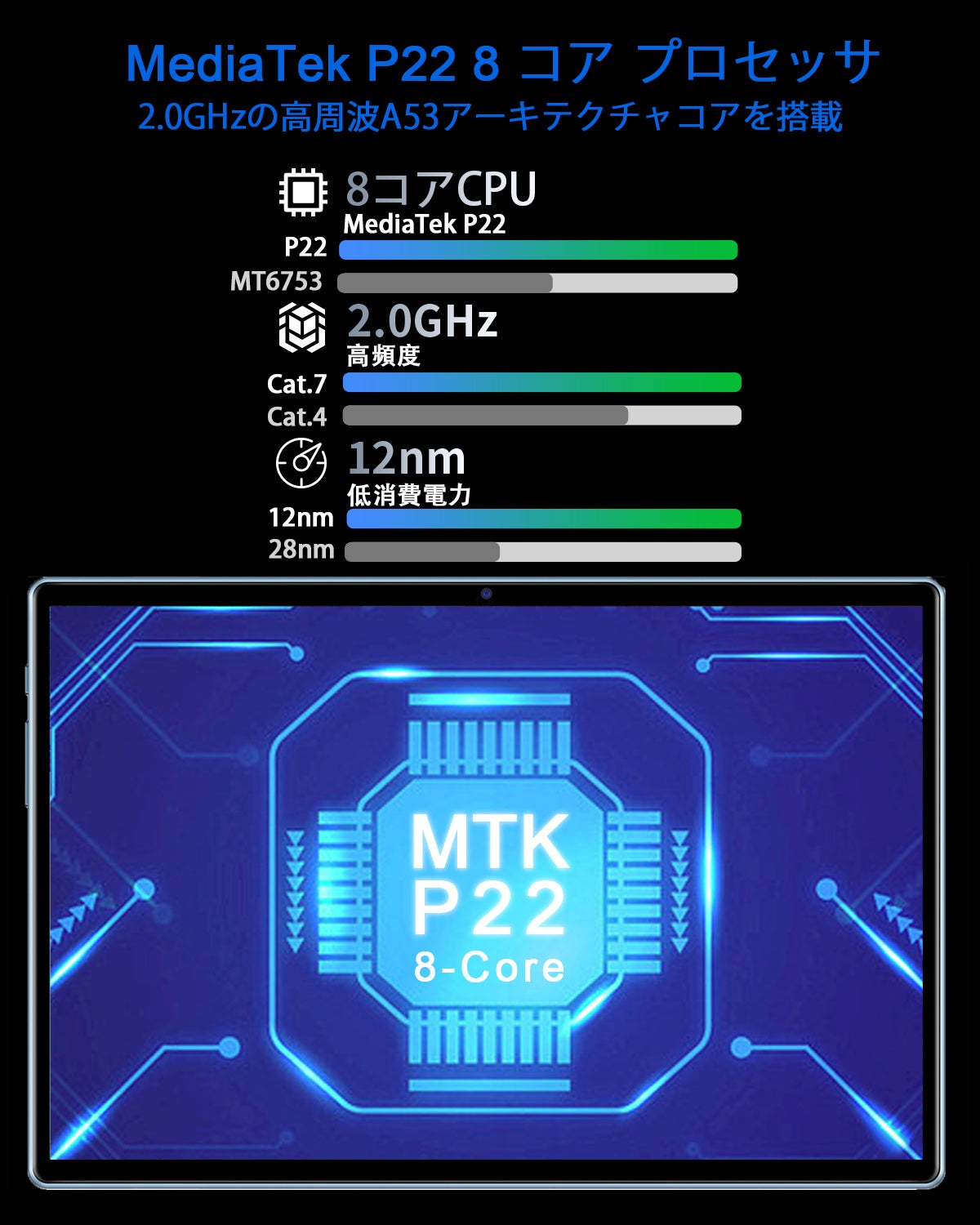 Amazon Android 12 タブレット P20S Media Tek製P22オクタコアプロセッサーを搭載ています。最先端の12nmプロセスにコアパイロット技術を加え、2.0GHzの高性能と高い周波数を維持しながら、低消費電力と低発熱を実現し、終始持続的な高性能と信頼性の高いユーザ体験を提供しています。