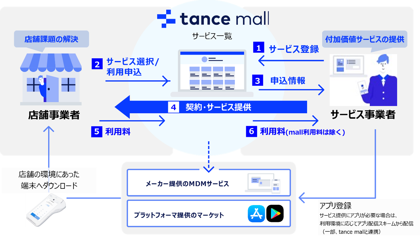 これにより「PayCAS Mobile」を使用する店舗事業者は、「PayCAS Mobile」のキャッシュレス決済機能に加え、「tance mall」上で集客強化や業務効率化、販路拡大などのサービス事業者の付加価値サービスを簡単に利用することができます。