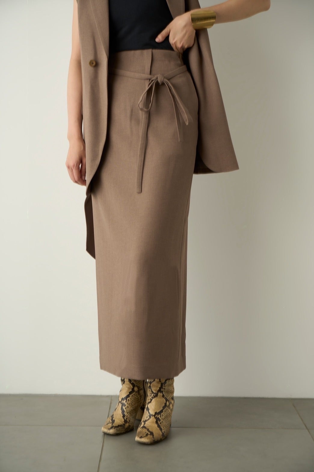 長めのウエストベルトが特徴的なペンシルスカート。ベルトは腰に巻き付けて、前後で結べるデザイン。