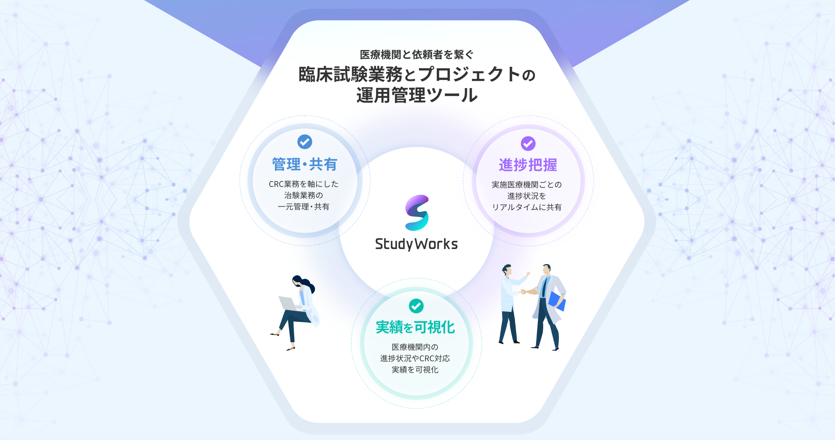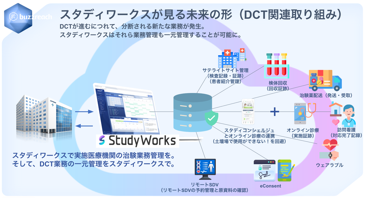 Study Worksの描く未来は治験業務管理や被験者募集促進に留まらず、DCT(Decentralized Clinical Trial:分散型臨床試験)のワンストップツールとしても今後対応していきます。