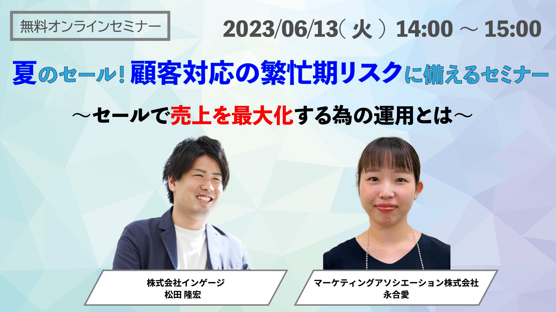 顧客対応クラウド『Re:lation(リレーション)』を開発・提供する株式会社インゲージ(本社:大阪府大阪市、代表取締役CEO:和田 哲也)は、マーケティングアソシエーション株式会社との共催セミナー「夏のセール!顧客対応の繁忙期リスクに備えるセミナー ~セールで売上を最大化する為の運用とは~」を6月13日(火)にオンラインにて開催いたします。