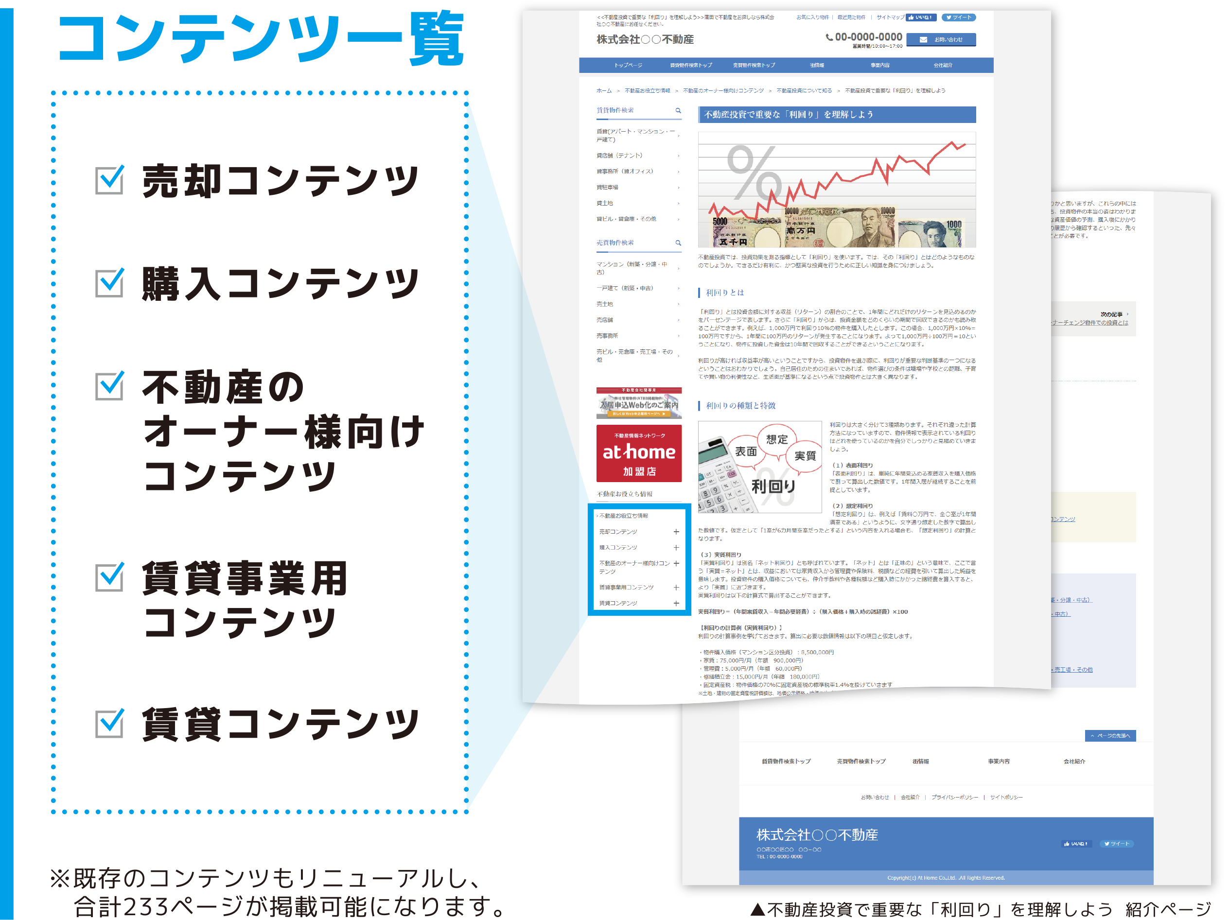 て」や「事業の成否を左右する出店立地について」など不動産のオーナー向けや、賃貸事業用など豊富なコンテンツを用意しています。記事制作にかかる不動産会社の業務負担を軽減し、ホームページの内容を充実させることができます。