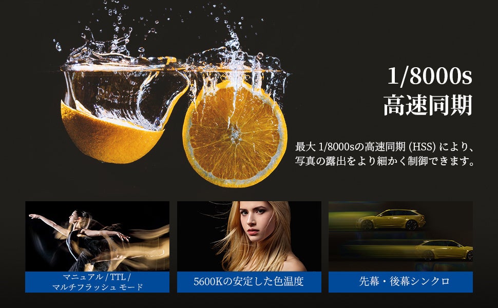 ・【5600Kの一貫した色温度、速いリサイクル時間 (0.4~2.5s)、フラッシュ持続時間 (1/800~1/2000s) 】