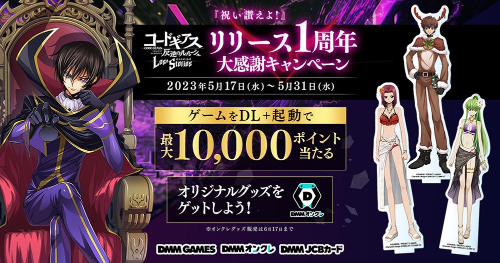期間中にDMMプレミアム会員に登録し、「コードギアス 反逆のルルーシュロストストーリーズ」を初めてダウンロード+起動した方の中から抽選で、DMMポイントが最大10,000ポイント当たるキャンペーンを開催!