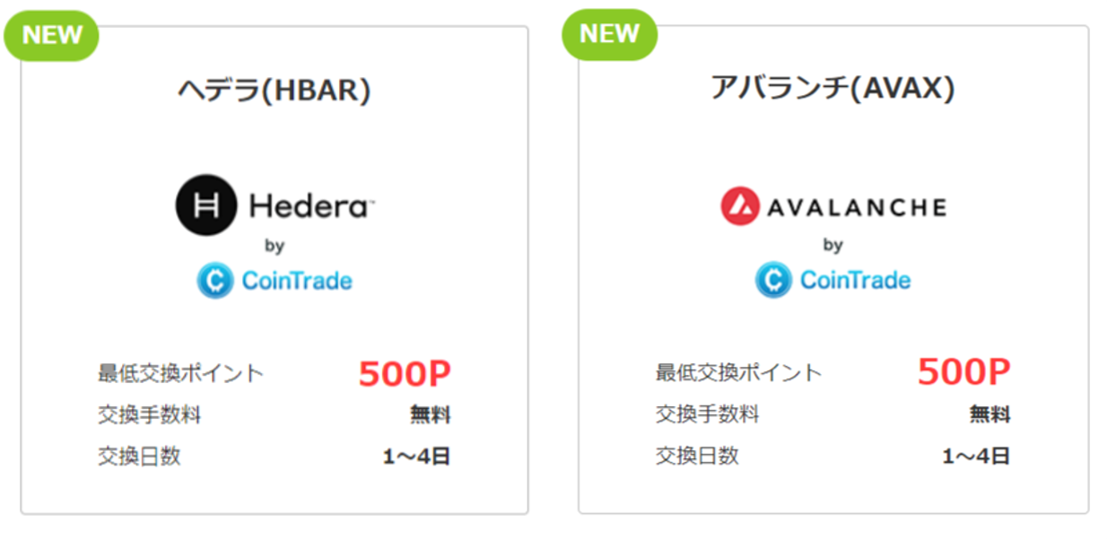 これによりポイントサイト「モッピー」では、既に交換対応可能なビットコイン(BTC)、イーサリアム(ETH)、リップル(XRP)、ライトコイン(LTC)、ビットコインキャッシュ(BCH)、パレットトークン(PLT)、アイオーエスティー(IOST)、カルダノ(ADA)、ポルカドット(DOT)、テゾス(XTZ)に加え、ヘデラ(HBAR)、アバランチ(AVAX)の全12種類の暗号資産とのポイント交換が可能になります。