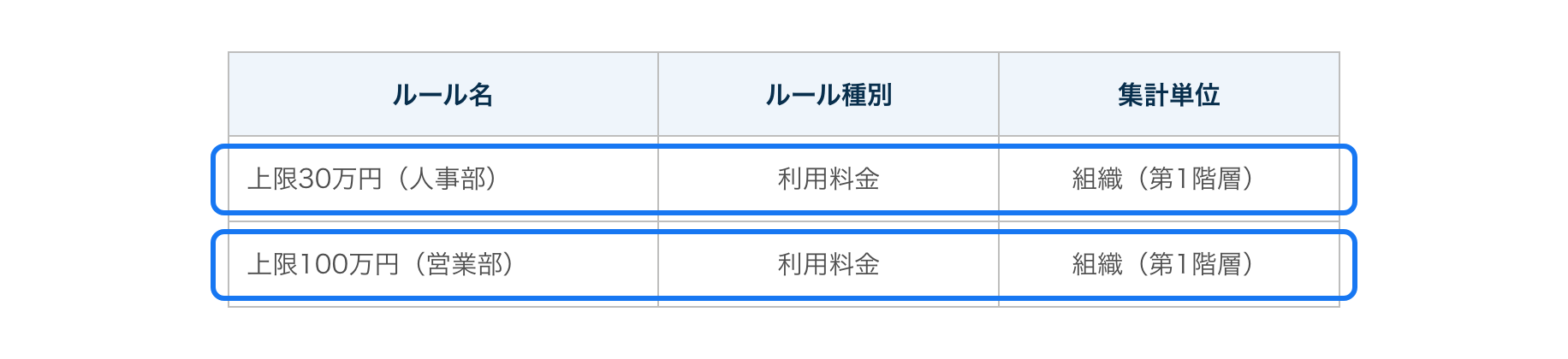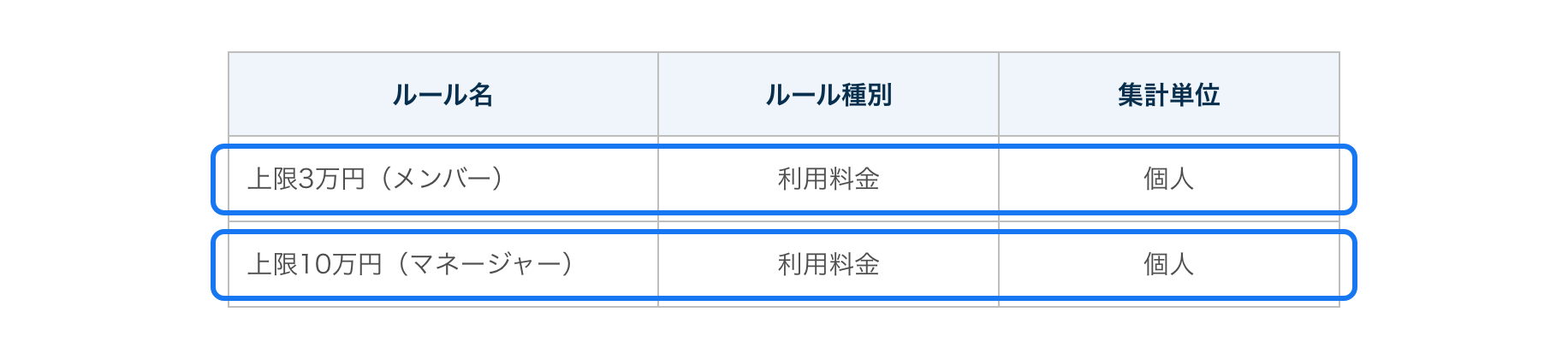 例えば、一般メンバーとマネージャー以上で制限金額を分けたい場合は、集計単位種別を「個人」に設定しそれぞれの利用上限ルールを作成することで、ユーザー毎に利用制限時間を管理できます。