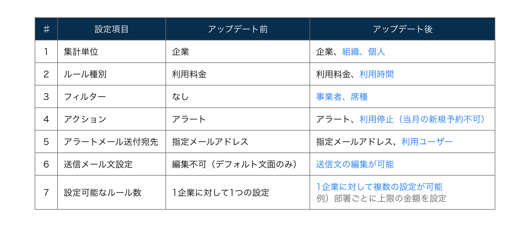 今回のアップデートにより、「利用管理機能」で設定できる制限の幅が広がります。また、同時に利用停止の機能を新たに追加することで、ご利用企業のコスト管理に向けたサポートをより強化いたします。