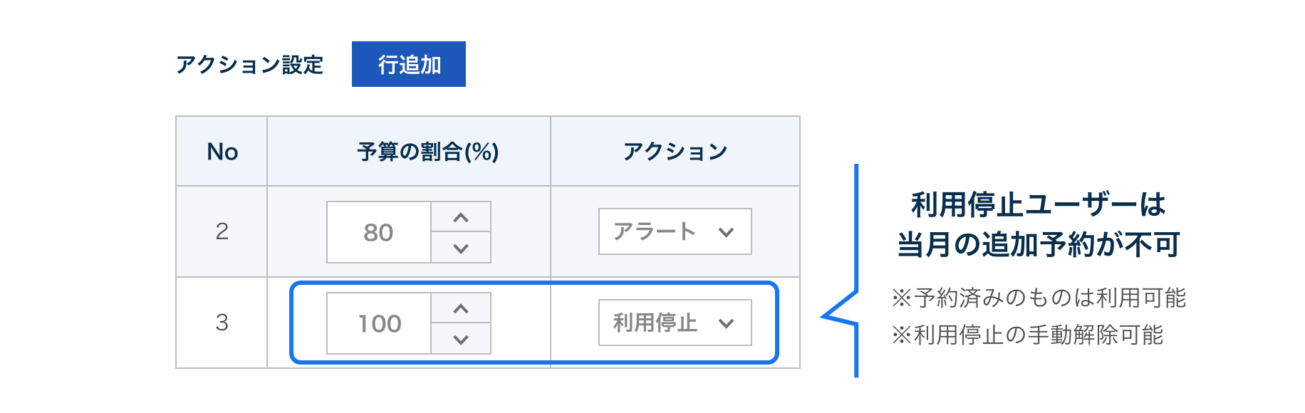 アラートメールの配信に加えて、管理者様側で利用停止措置が可能になりました。利用停止ユーザーは当月の追加予約が不可となるため、コスト管理がよりしやすくなります。