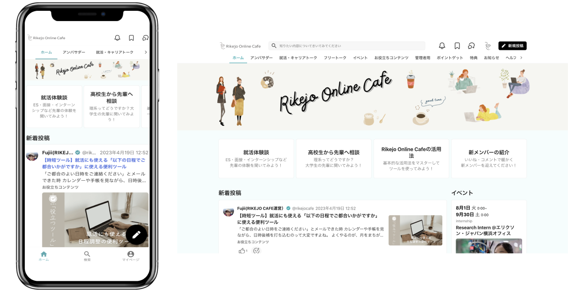 女子高校生・理系女子大学生・大学院生・理系出身女性社会人を対象にキャリアについて共有し交流しあう会員制コミュニティです。「Rikejo Online Cafe」は数少ない理系女子同士を繋げ、雑談・相談し合える場所を提供し、キャリアをサポートします。会員は進学・就活の悩みを気軽に相談したり、理系学生・社会人に役立つ情報を共有・取得することができます。また、入会には運営との事前面談を実施しており、安心してご利用いただけます。