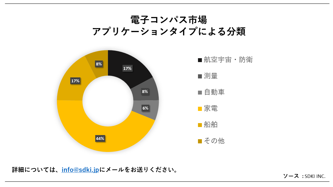 技術に基づいて、ホール効果型電子コンパスが、ナビゲーションの精密さと正確さにより、世界の電子コンパス業界で最大の市場シェアを占めています。さらに、ホール効果ベースの電子コンパスは、ナビゲーションに依存するため、今日、自動車、家電、航空宇宙分野で広く使用されています。さらに、ホール効果電子コンパスは、フラックスゲート技術や磁気抵抗技術など、他の電子コンパスと比較して小型・軽量で高精度で す。ホール効果型電子コンパスは小型であるため、スマートフォンやタブレット端末に搭載されることも多くなっています。国際電気通信連合のデータによると、携帯電話ユーザーは50億人を超え、1人につき少なくとも2台の携帯端末が使用されています。このような大規模なユーザーベースと、ホール効果電子コンパスが提供する多様な有用性により、このセグメントは予測期間中に明るい展望が開けると思われます。