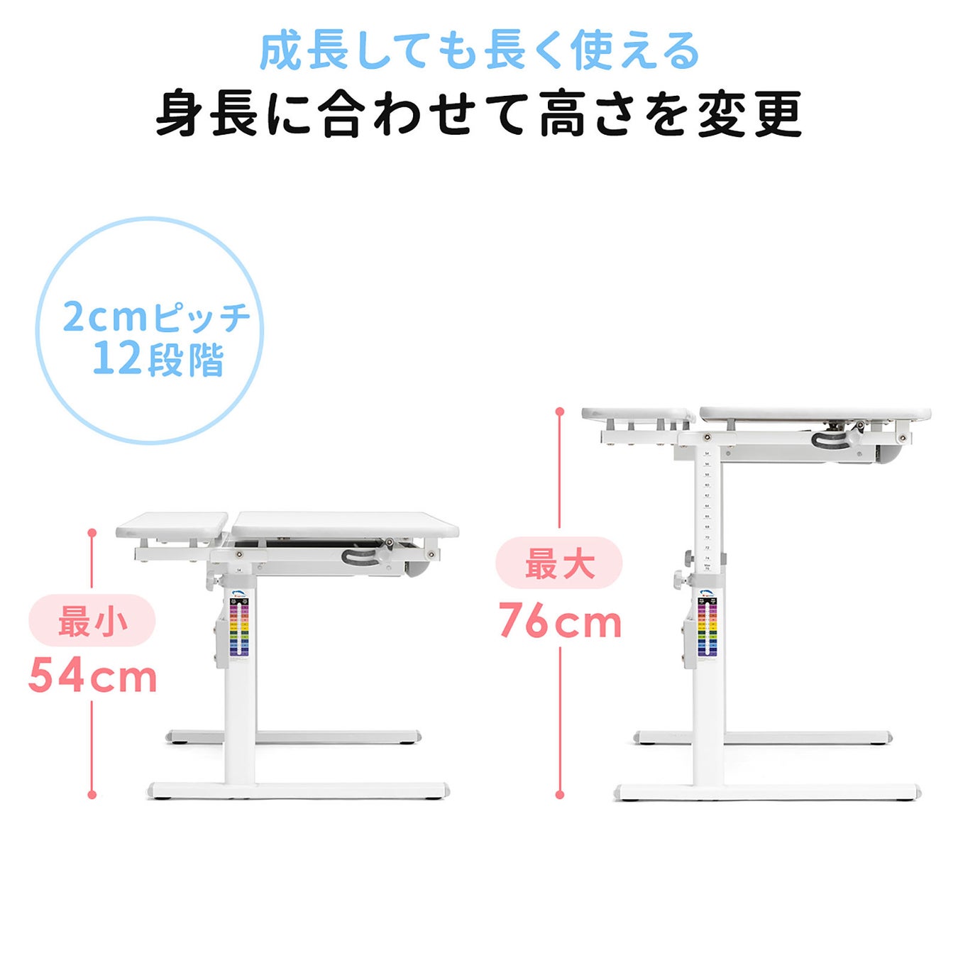 本製品は、天板の高さを54cm~76cmまで調整できる子供向けデスクです。成長に合わせて天板の高さを変えられるため、長く使用することができます。