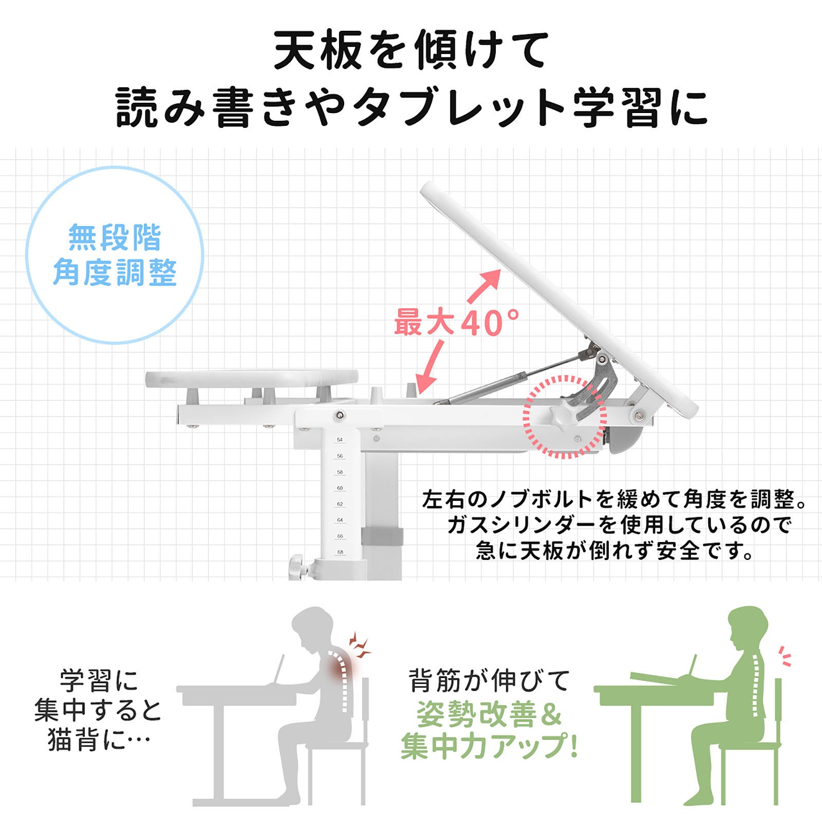 天板は、最大40°まで調整できる無段階仕様で読み書きやタブレット学習に合わせて調整できます。天板は閉じるときに急激に落下しないよう、ダンパーで支えています。
